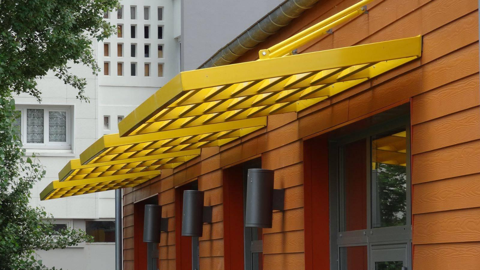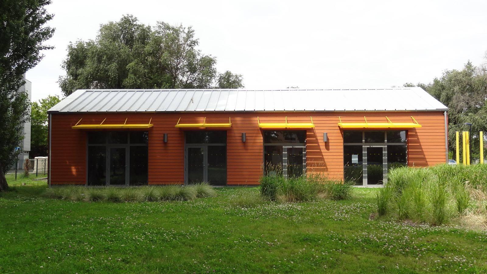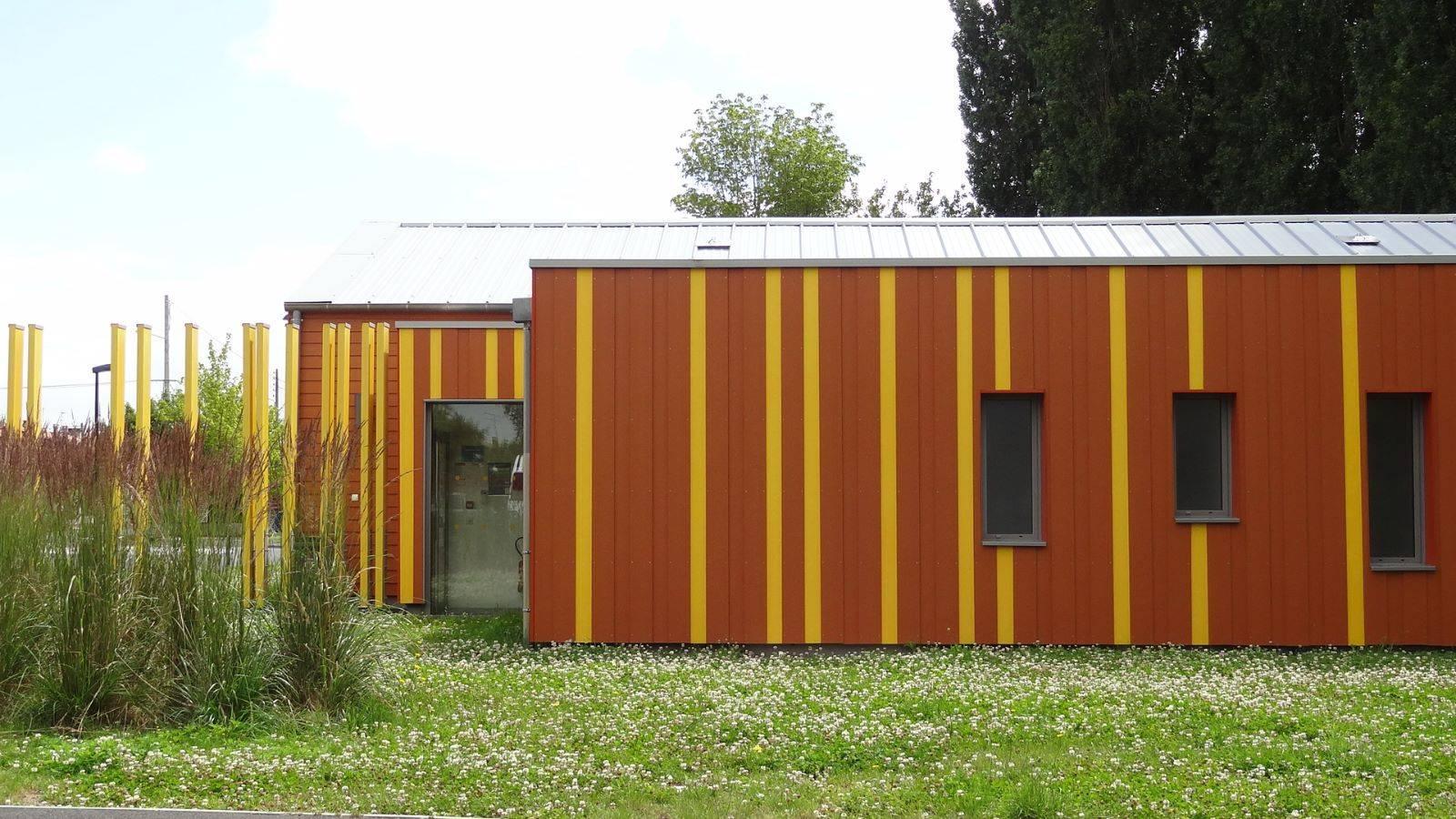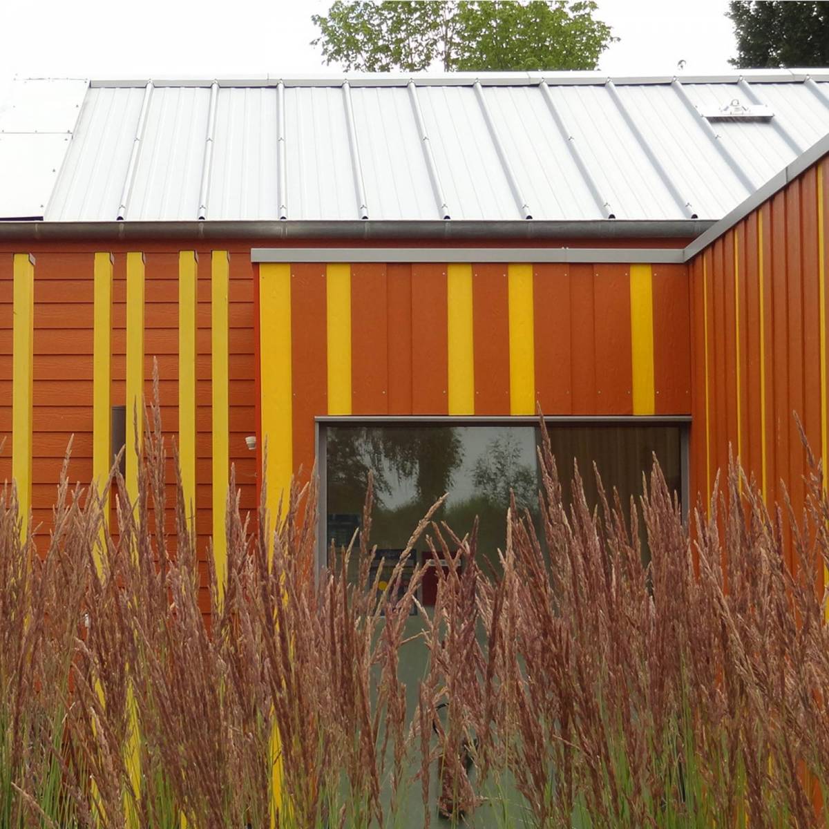 L’architecture se développe en deux volumes : un volume principal couvert par une toiture à 2 pentes accueillant la salle associative ; un second, adossé et couvert par une toiture terrasse, regroupant le hall et les locaux communs.