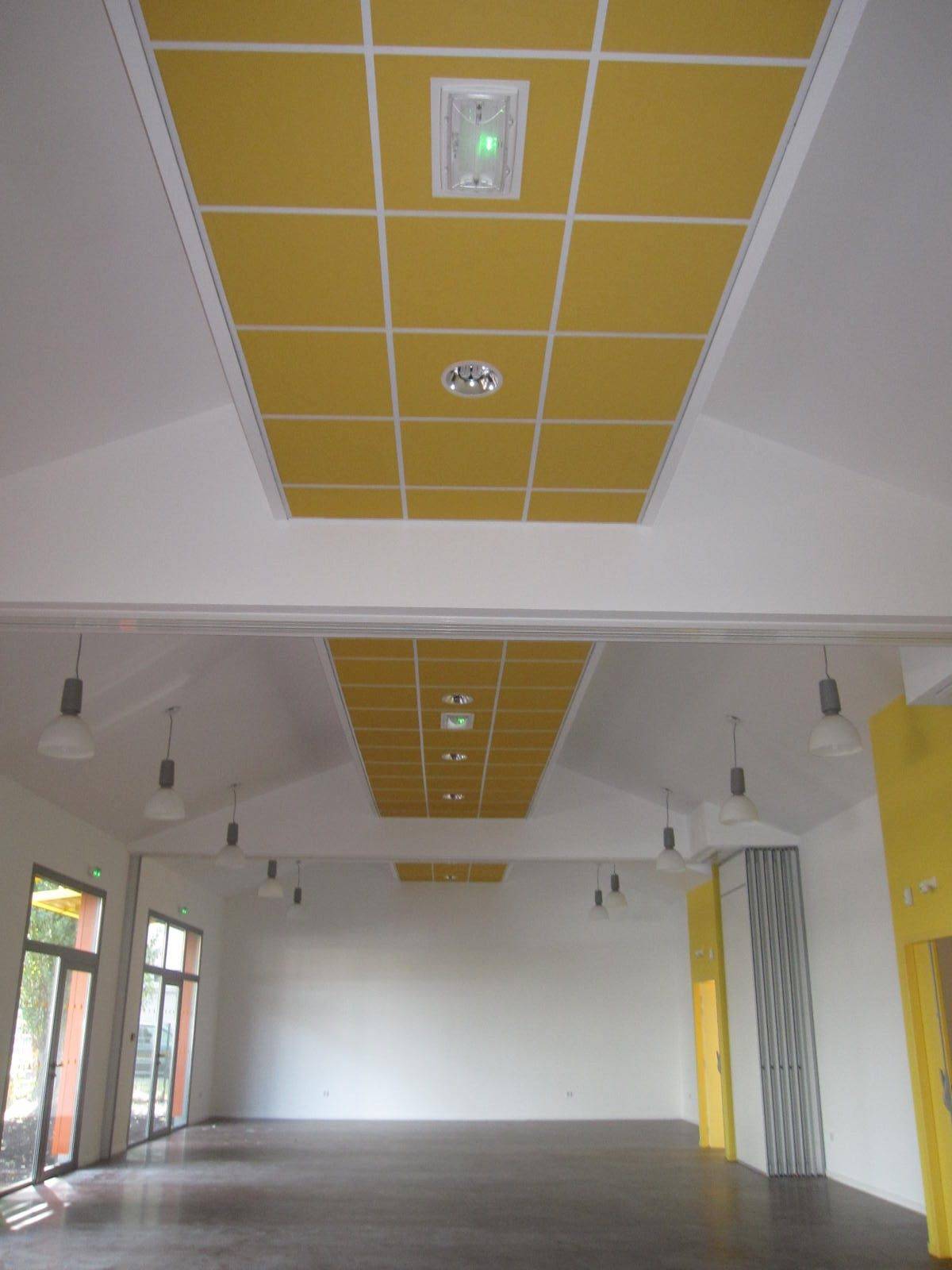 La grande salle orientée Est bénéficie également de l’ombrage des grands peupliers. A l’intérieur, le plafond rampant apporte volume et confort. Deux parois amovibles et acoustiques ALGAFLEX permettent de diviser l’espace en 3 salles de réunion afin de répondre aux besoins multiples.