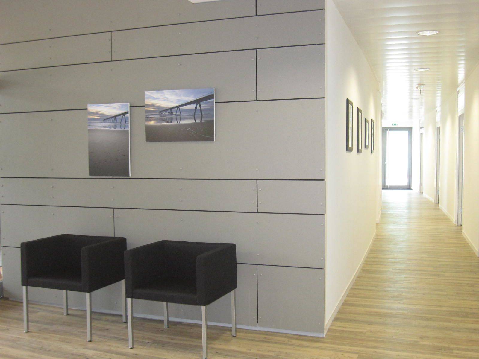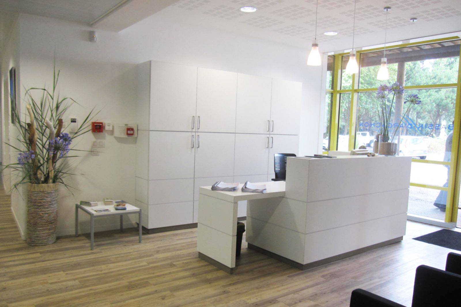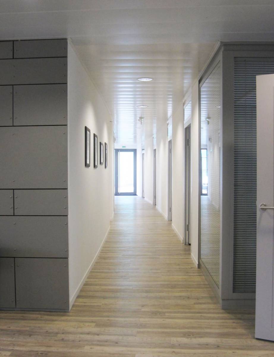 Le schéma fonctionnel est simple et rationnel : de part et d’autre du hall d’entrée positionné en partie centrale, un dégagement traversant le bâtiment de part en part dessert les bureaux. Les salles de réunion sont regroupées à proximité du hall.