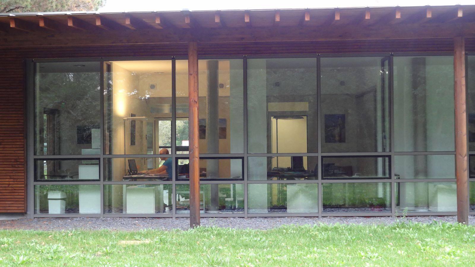 Le volume s’étire et développe ses façades aux revêtements contrastés : à l’est coté parking, les  panneaux de fibre ciment sont soigneusement calepinés et confère un caractère minéral aux façades ; pour les autres, un bardage en douglas encadre le mur rideau, protégé par un auvent en charpente bois et couverture zinc. Face à la forêt, ce mur rideau ouvre généreusement les bureaux qui bénéficient ainsi d’une protection solaire complémentaire.