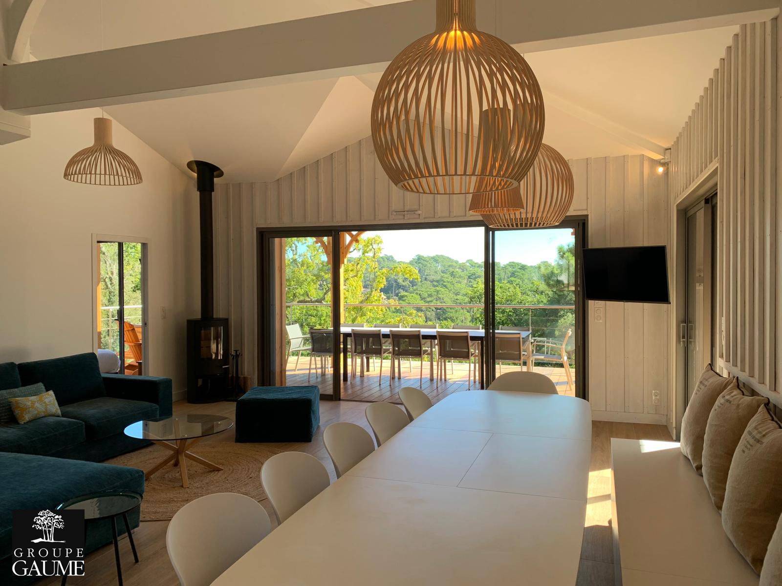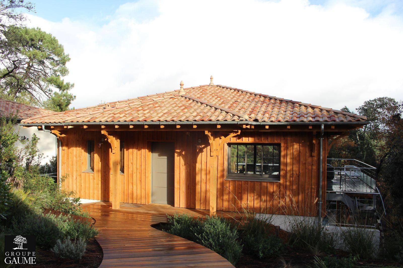 Construction d’une villa esprit cabane avec piscine à débordement par le groupe Gaume et son architecte sur le Bassin d’Arcachon