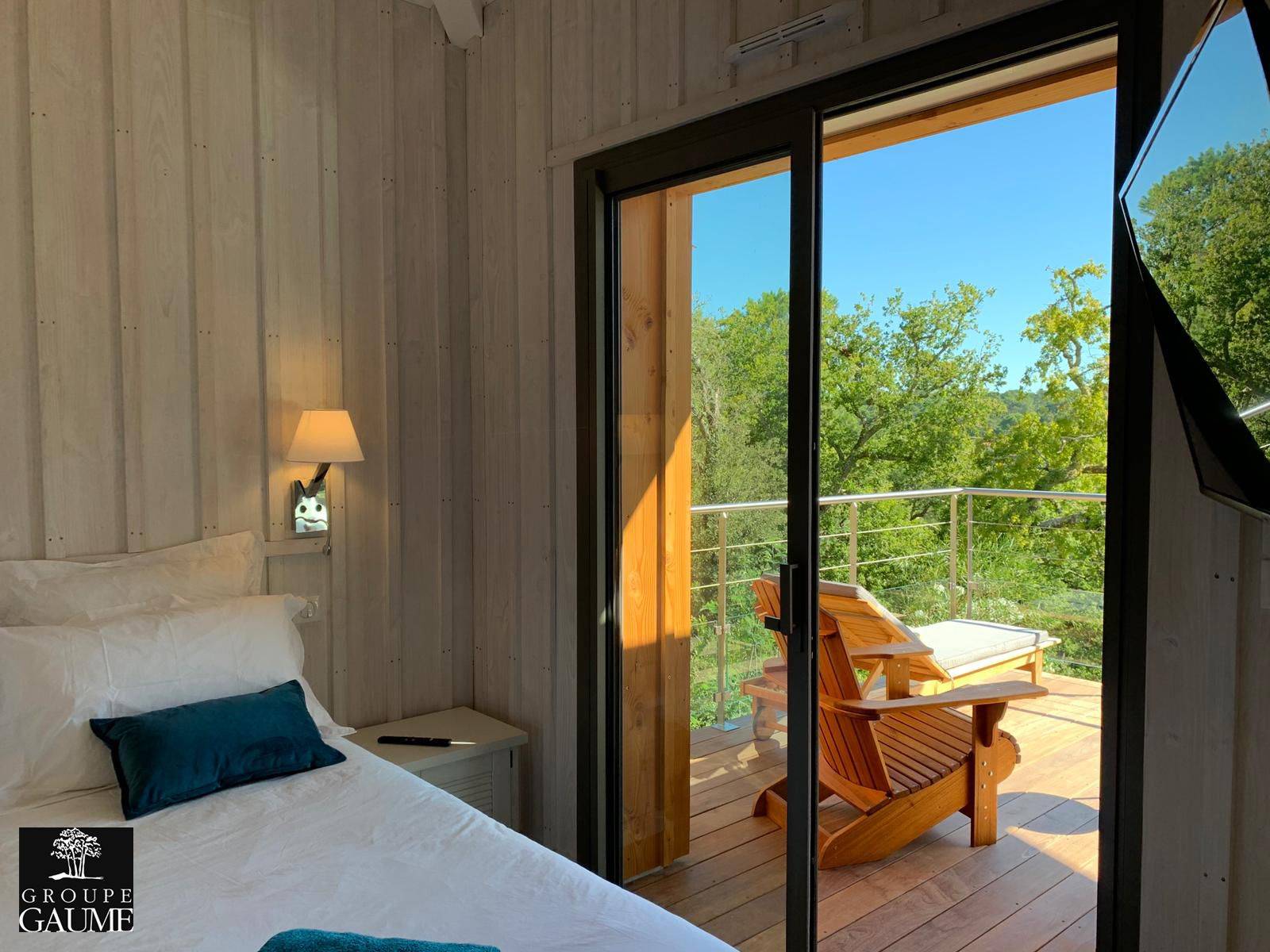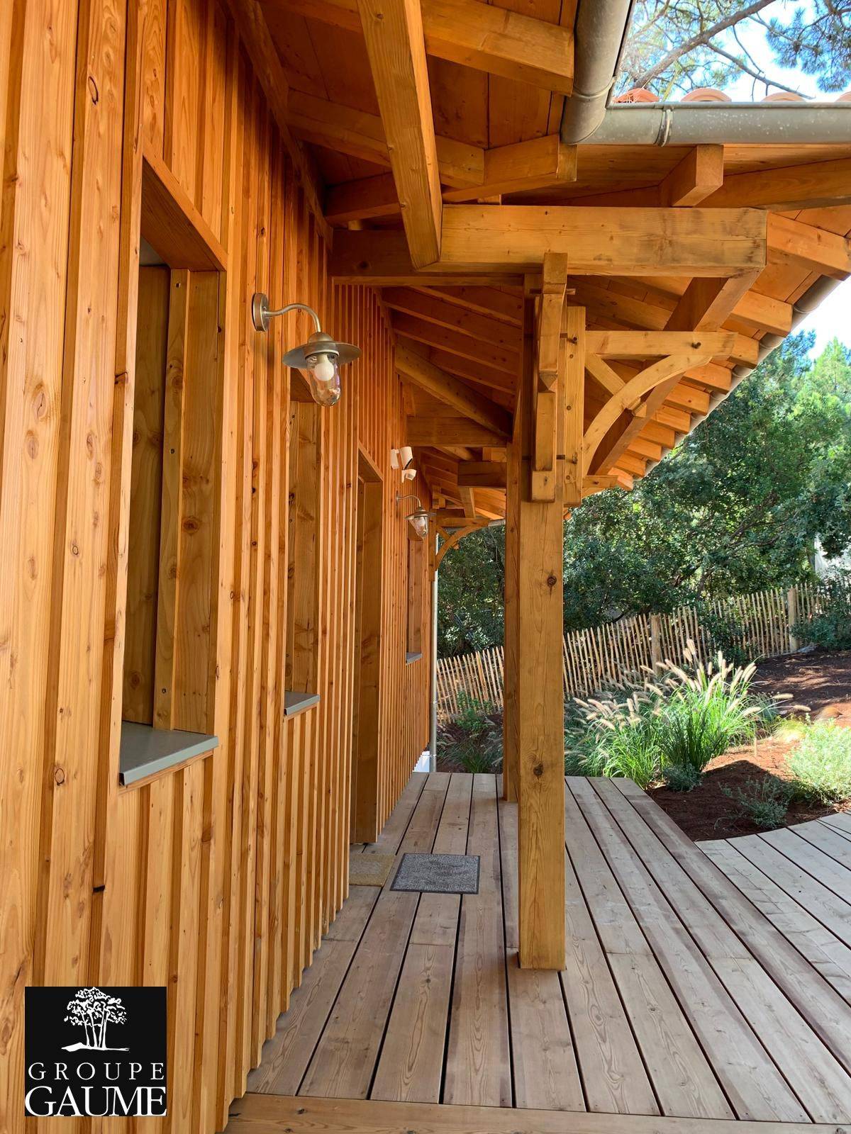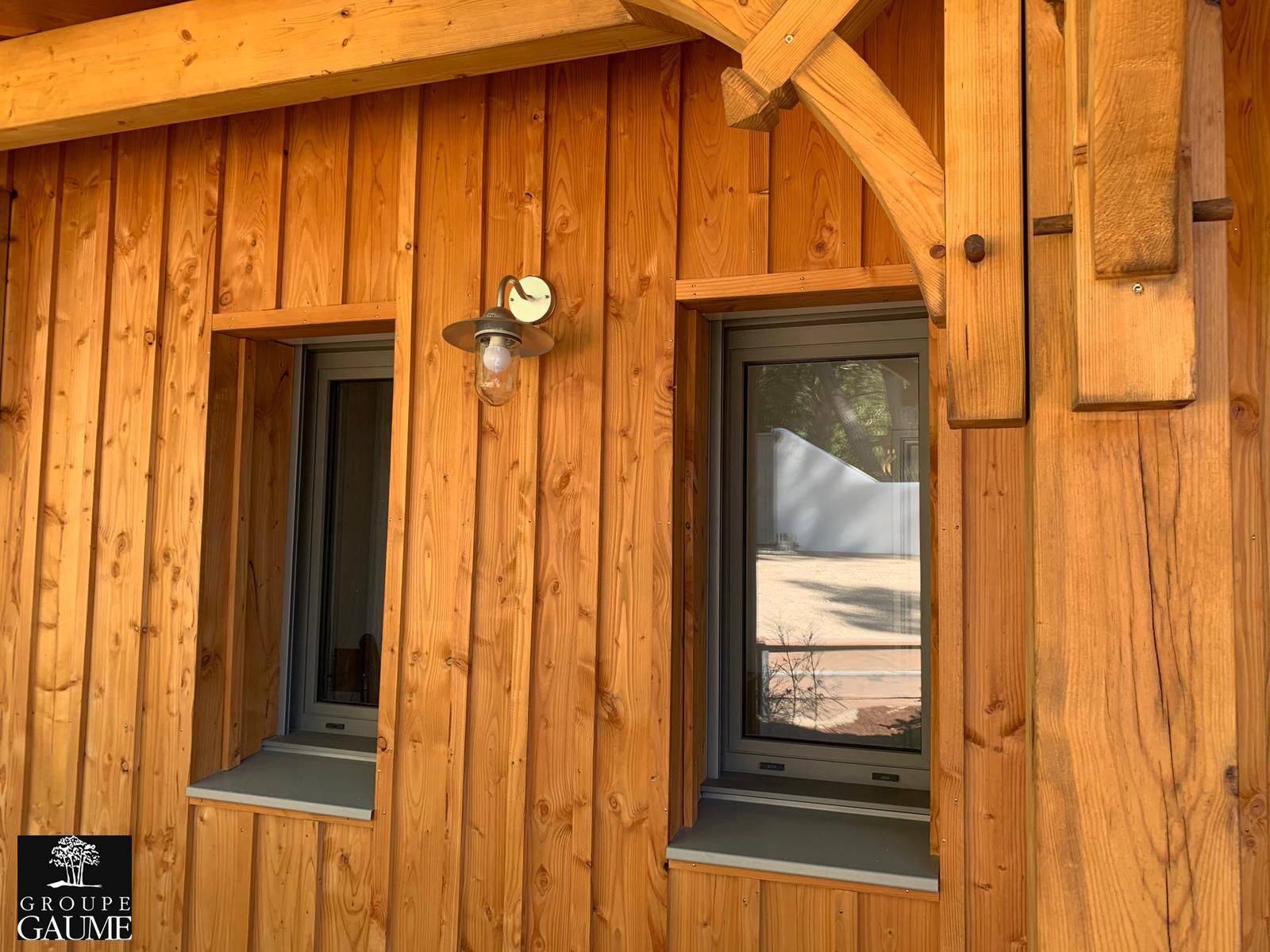 L’esprit cabane se traduit par une charpente traditionnelle bois, un bardage en douglas à couvre joint face extérieure et intérieure.