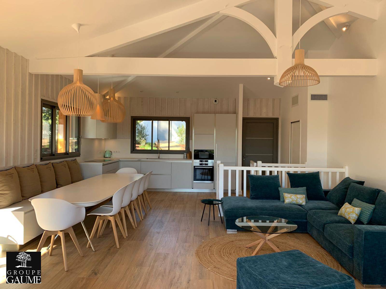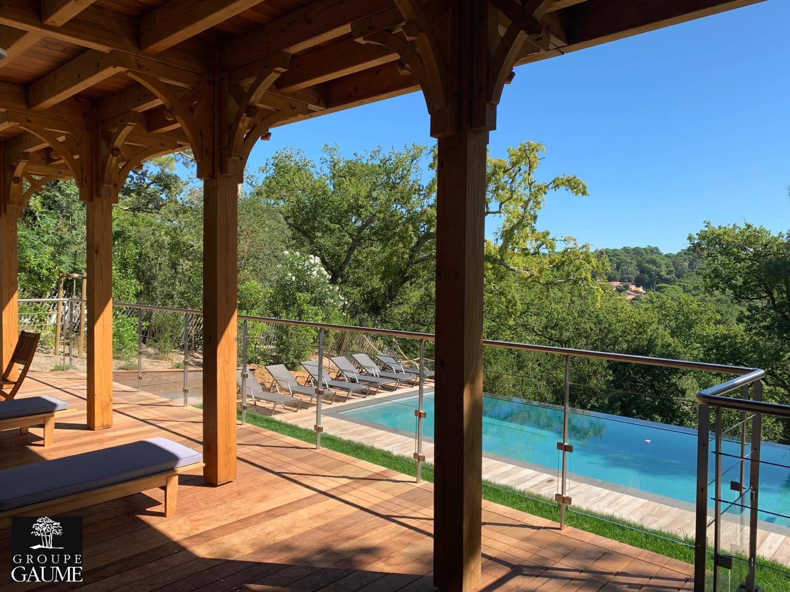 Construction d'une villa esprit cabane avec piscine à débordement par le groupe Gaume et son architecte sur le Bassin d'Arcachon