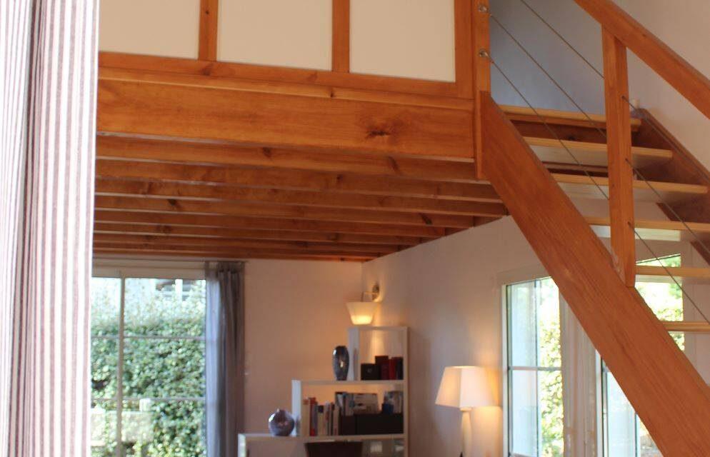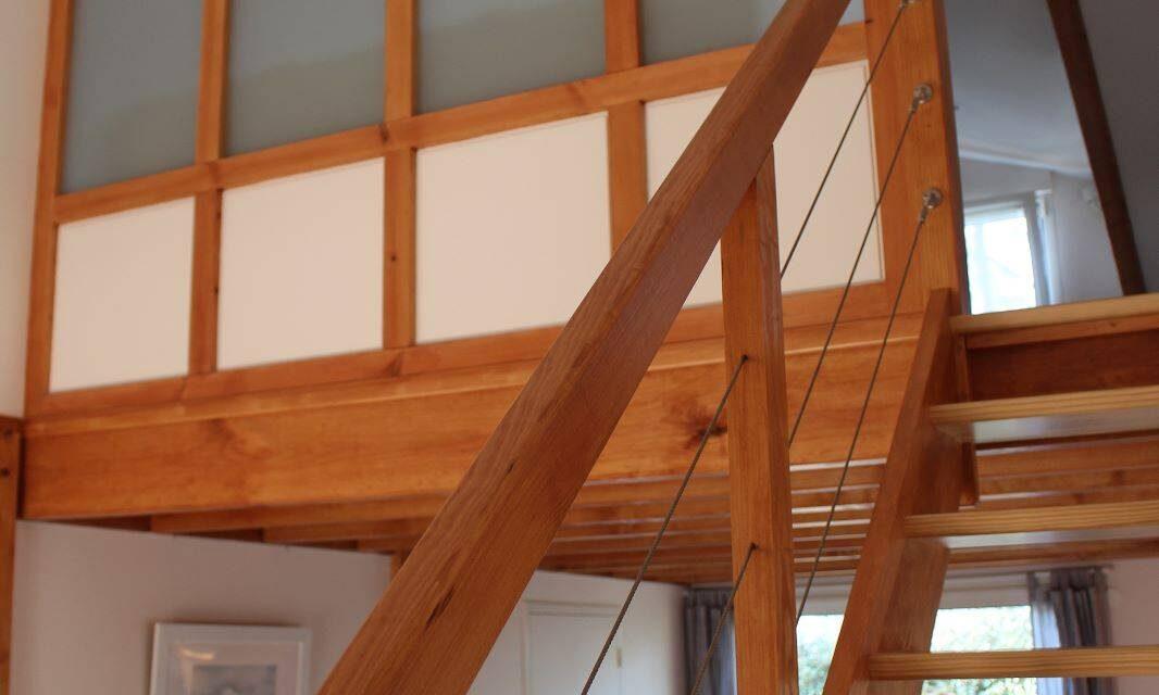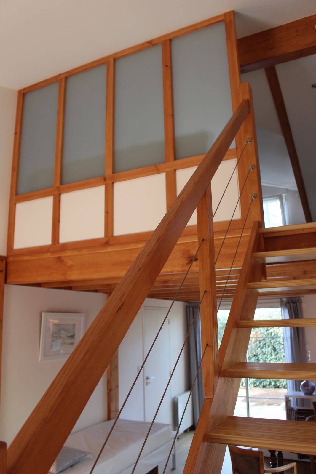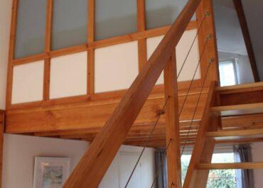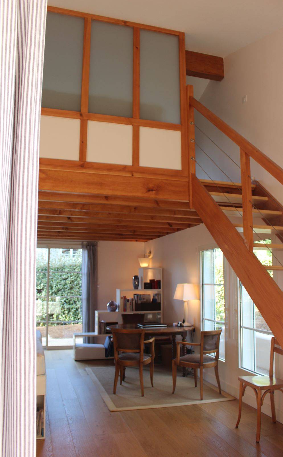 Pour cette extension, nous avons proposé un volume en double hauteur, avec une mezzanine et un escalier confortable, permettant également d’accéder aux combles existants. Une baie atelier en bois intimise les nouveaux combles.