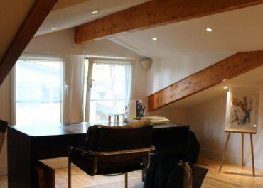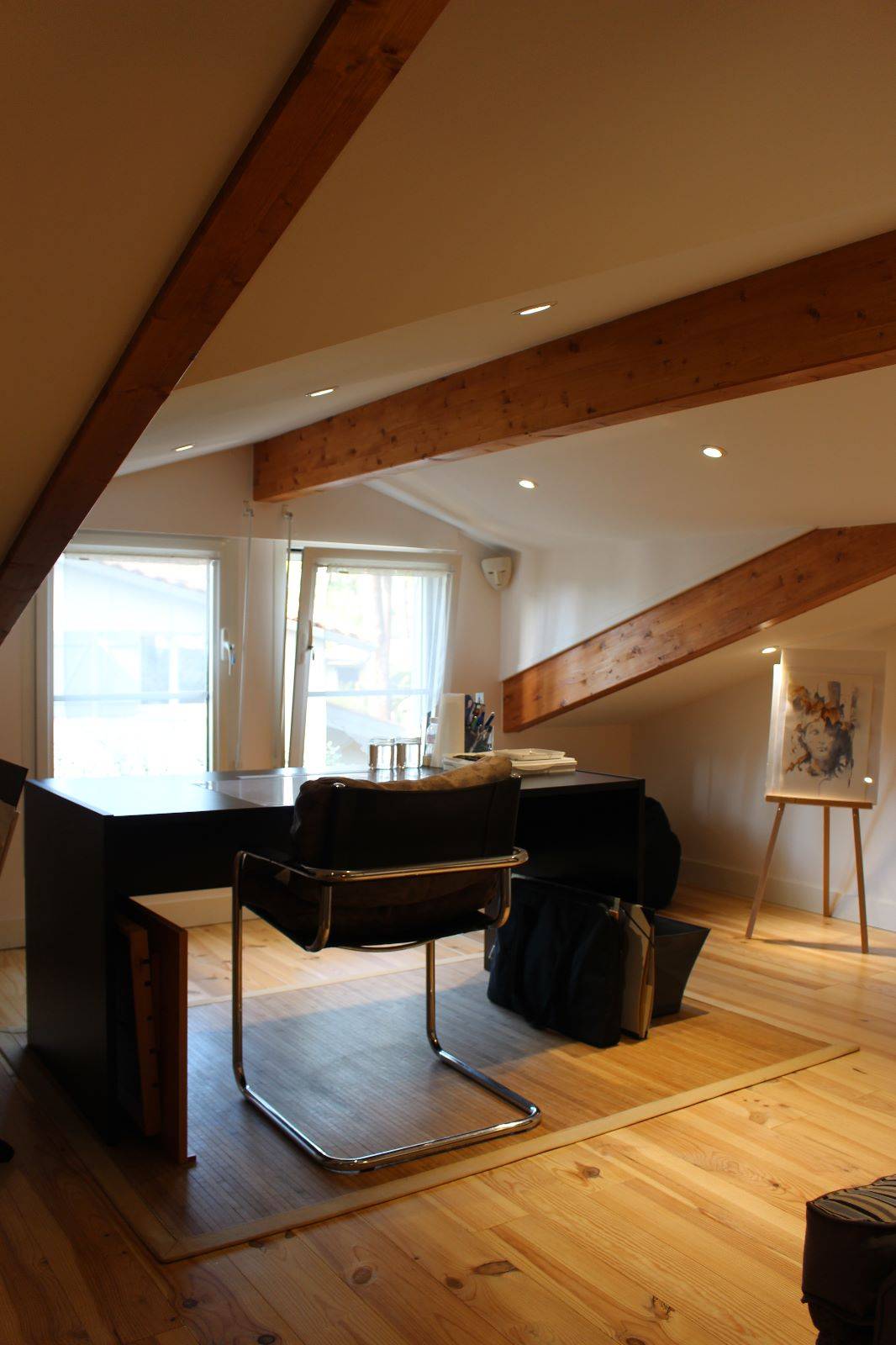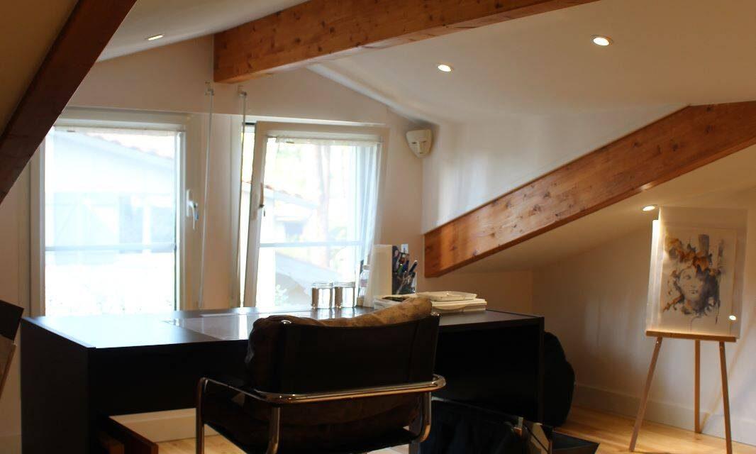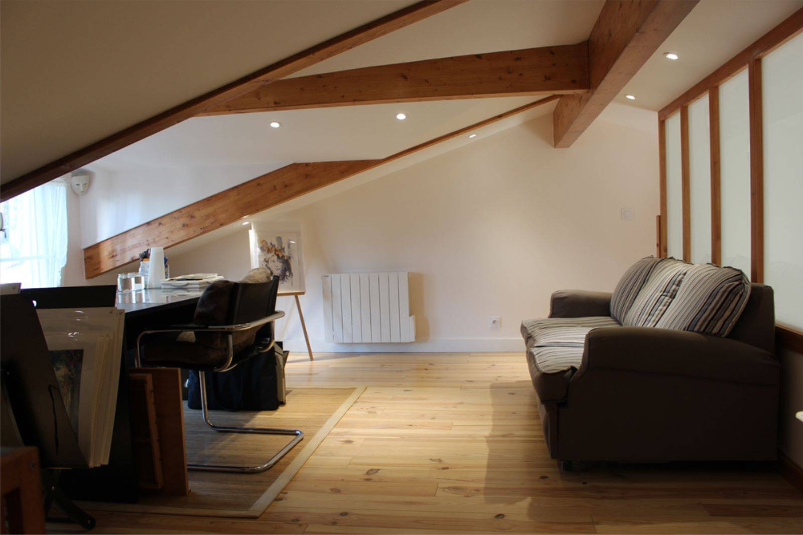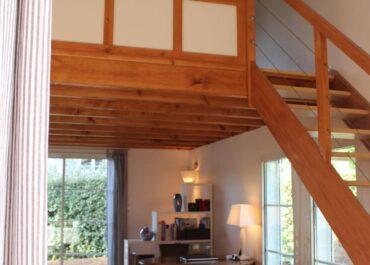 Pour cette extension, nous avons proposé un volume en double hauteur, avec une mezzanine et un escalier confortable, permettant également d’accéder aux combles existants. Une baie atelier en bois intimise les nouveaux combles.