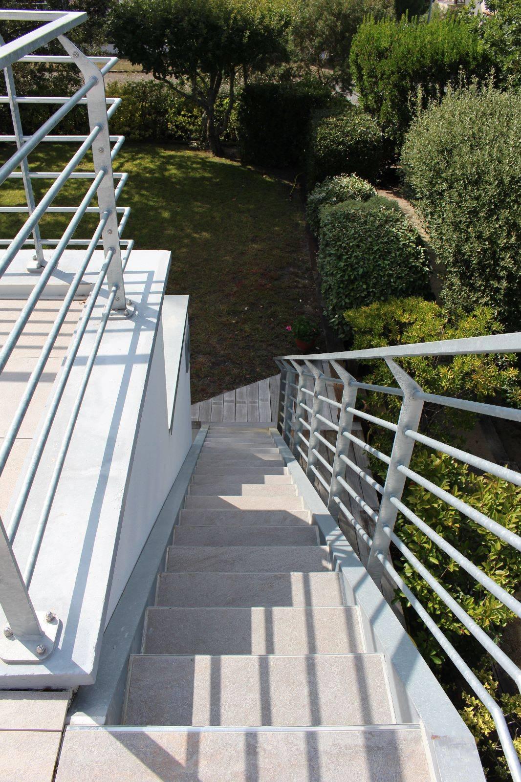 Les façades de l’extension sont en maçonnerie blanche, la terrasse haute revêtue de dalles en grès cérame pleine masse, entourée de garde-corps acier galvanisé.