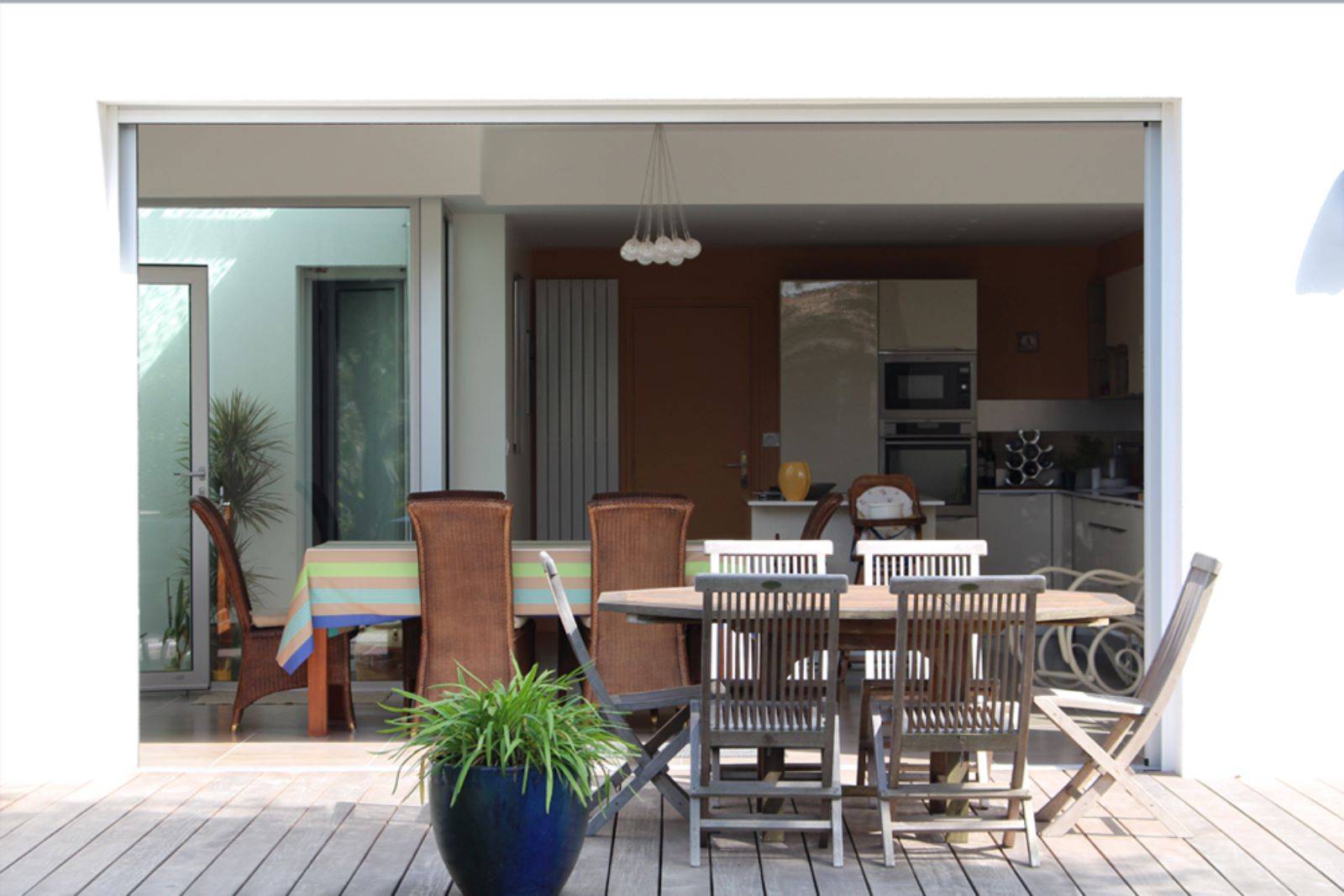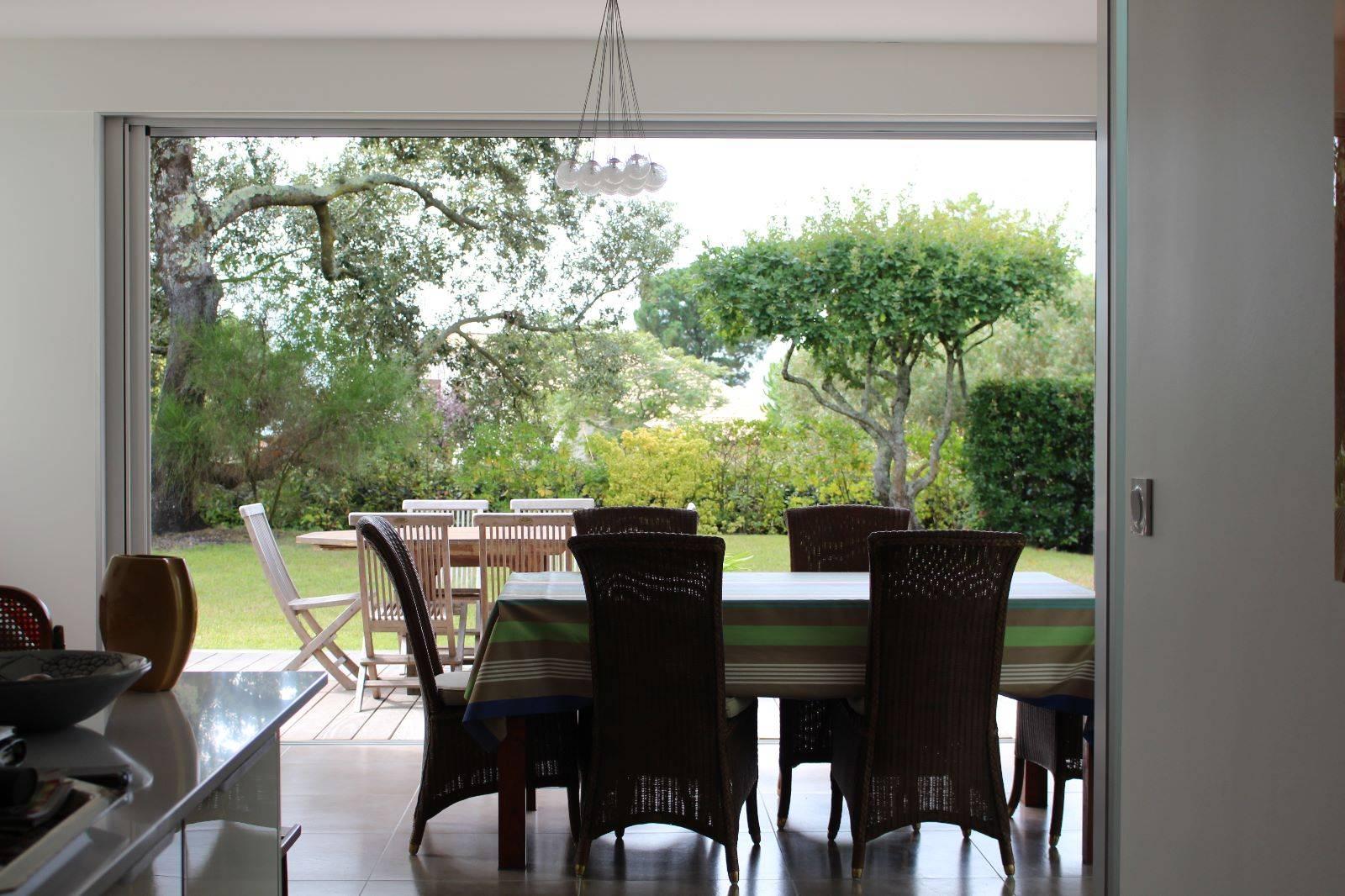 Une large menuiserie à galandages s’efface dans les murs, l’intérieur et l’extérieur ne forment qu’un seul espace ouvert sur le jardin.