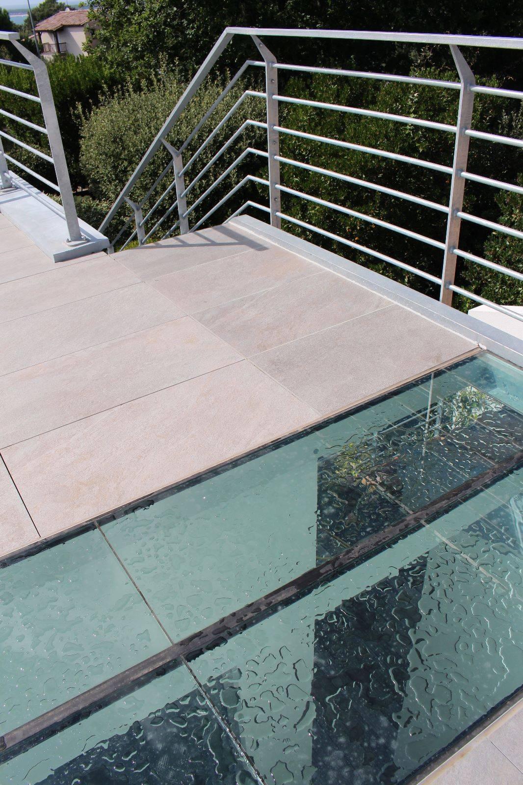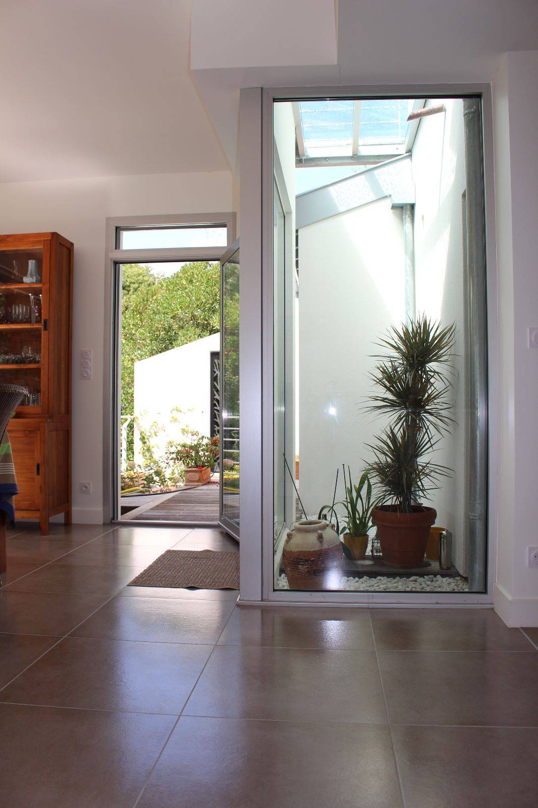 Une verrière plate éclaire un patio.