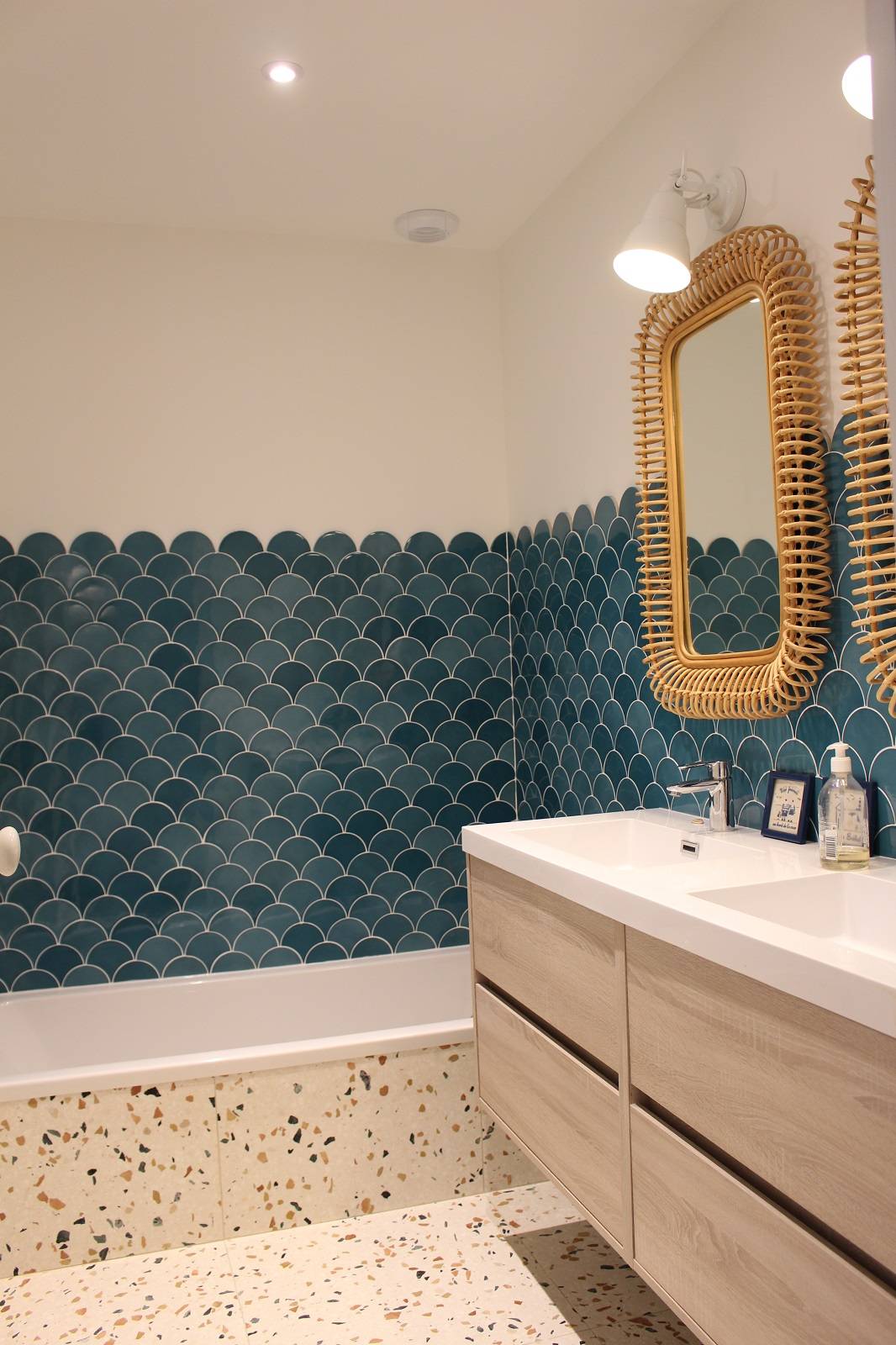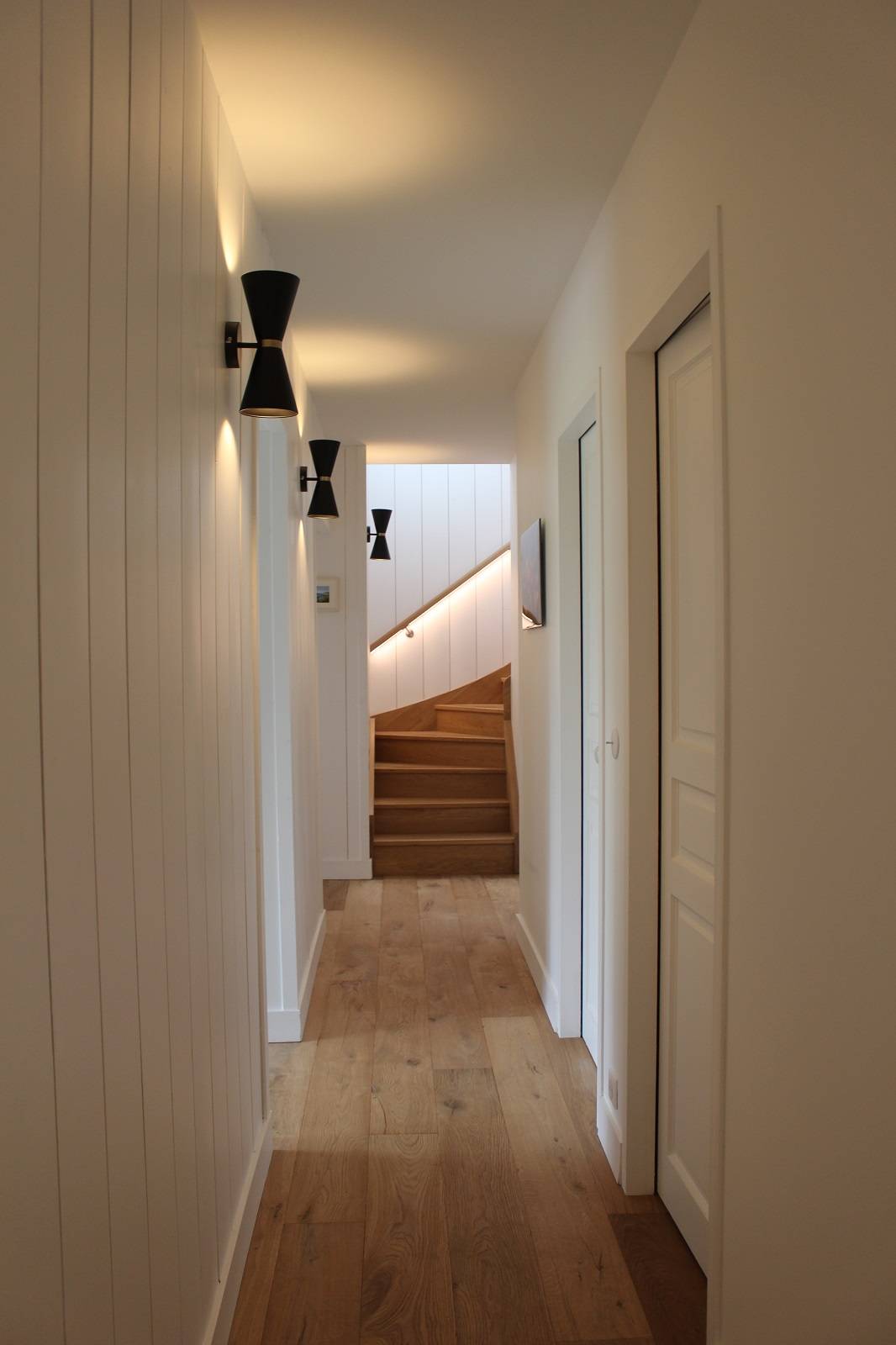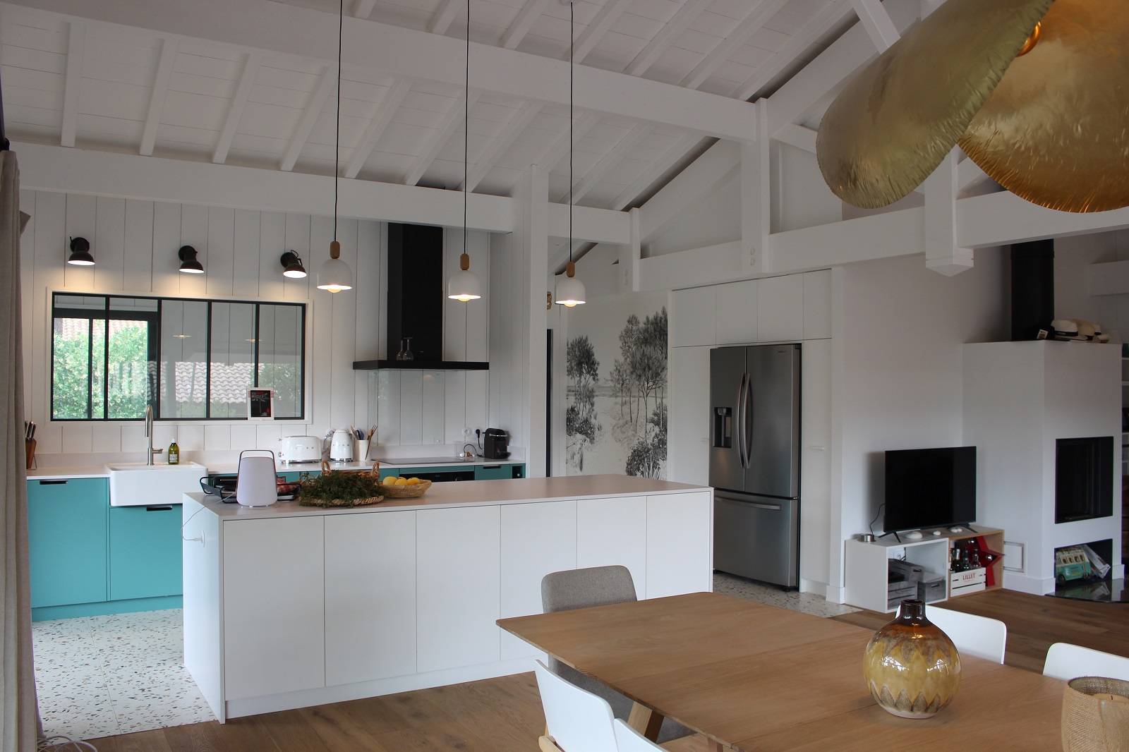 La villa existante sur 2 niveaux a bénéficié d’une rénovation lourde : l’espace de vie a été totalement réaménagé, les fermettes ont été remplacées par une charpente traditionnelle en bois : les fermes, pannes, chevrons et voliges apparentes donnent ainsi un style « cabane et bord de mer ».
