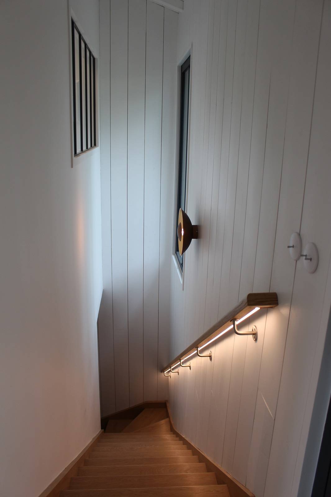 A l’intérieur et l’extérieur, le bois prédomine : lambris sur les murs intérieurs, voliges bois sur chevrons en plafond rampant, bardage en douglas à pose verticale et couvre joint à l’extérieur.