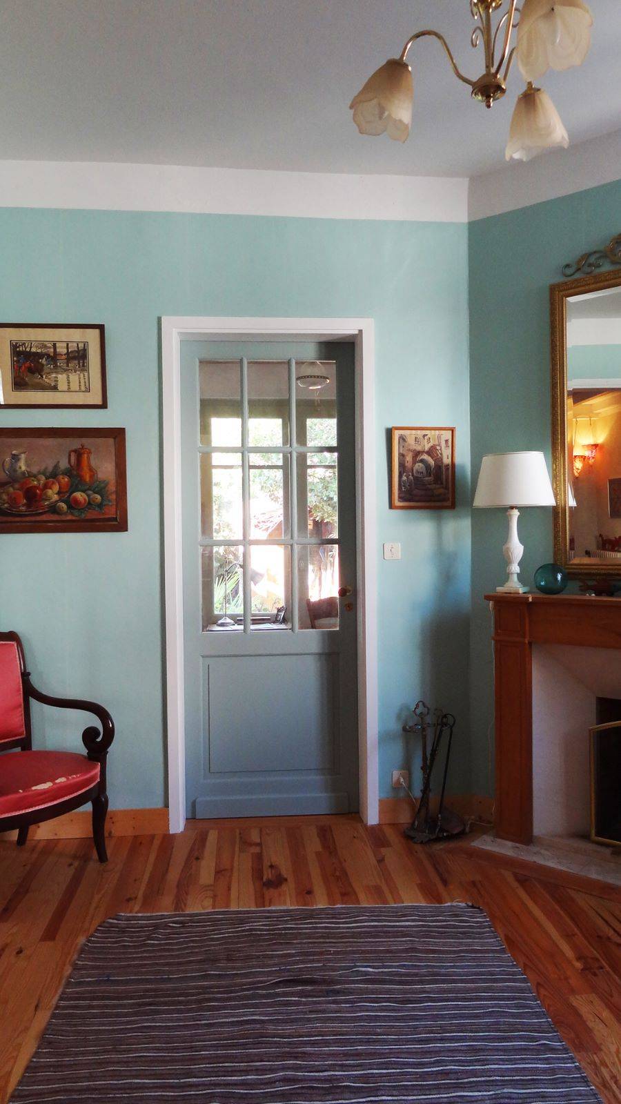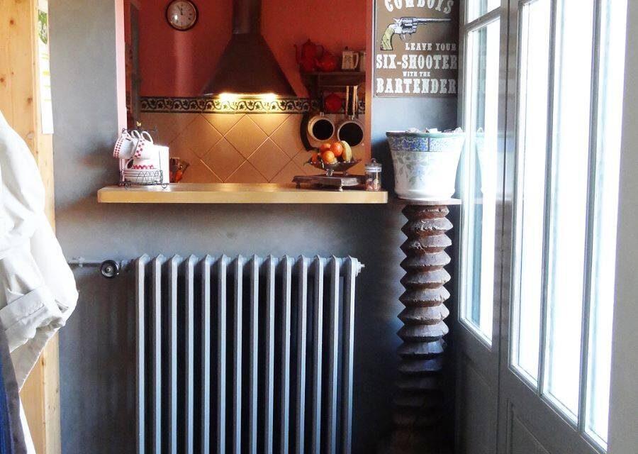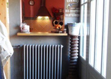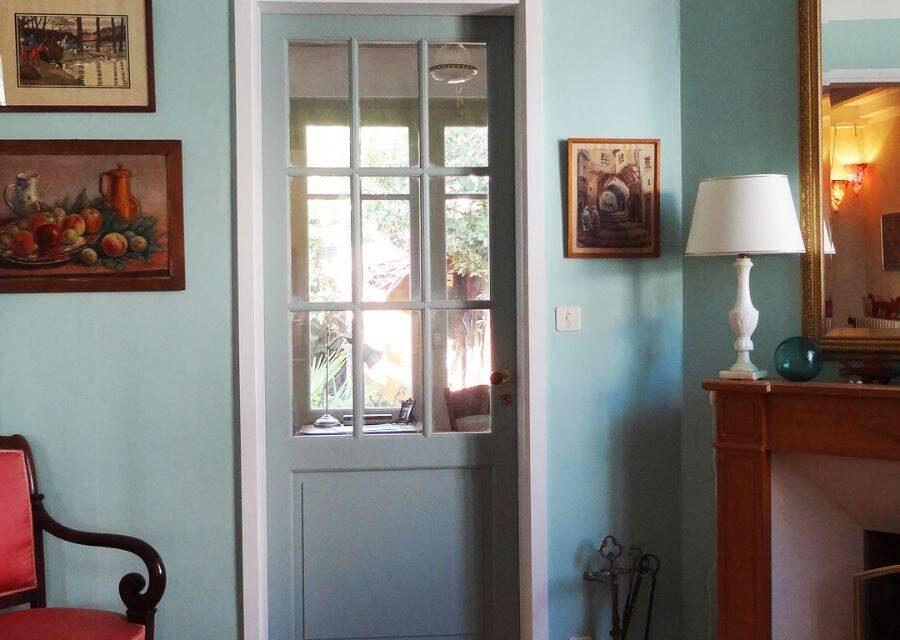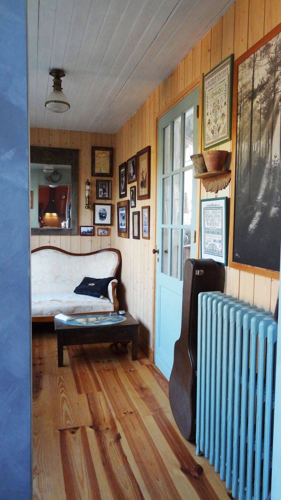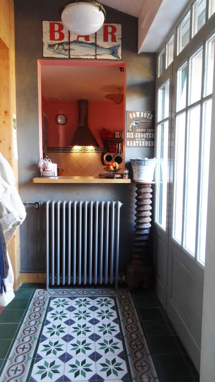 Au sol, des carreaux de ciments décorés ont été mis en œuvre dans l’entrée, cuisine et salle d’eau. Un plancher en Pitchpin dans le petit salon.