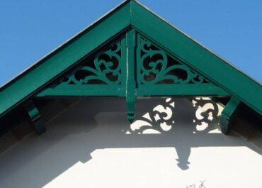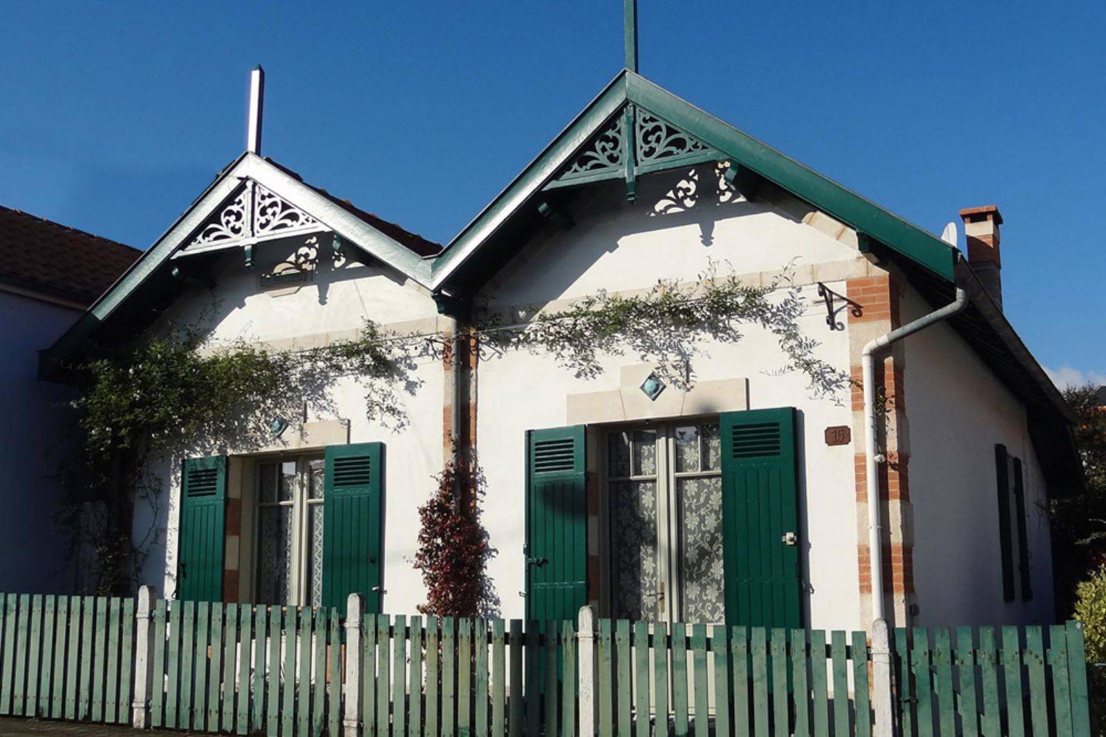 En façade, les menuiseries ont été remplacées par des menuiseries en bois avec petits bois et soubassements, les volets remplacés ; des dentelures en bois ont été créées en partie haute des avant-toits. Les chainages en pierre et briquettes ont été restaurés, des cabochons en céramique posés au-dessus des fenêtres.